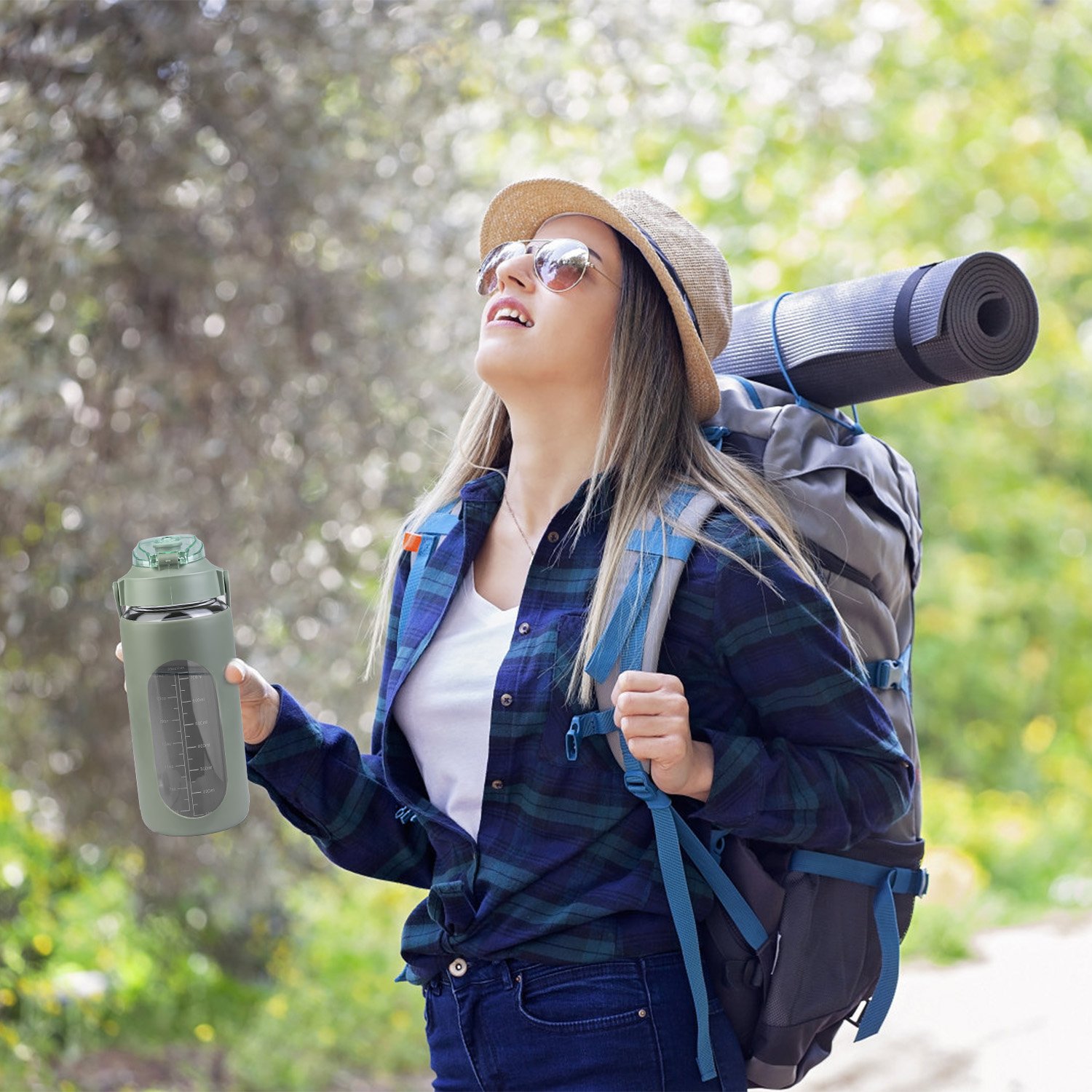 Are you tired of forgetting to stay hydrated throughout the day? Look no further than our motivational water bottle! Comes with timer markers and and precise volume on the side, helping you track your water intake with ease. With its large capacity(32Oz or 64 Oz), you can refill the sports water bottle up less frequently and keep yourself refreshed all day long. Made of high borosilicate glass, suitable for both warm and cold beverages, heat-resistant, dishwasher safe and healthy to use. Slip resistant with silicone sleeve and easy to carry with a built-in handle. And for added convenience, it features a built-in straw, making it easy to drink water on the go. Plus, its stylish design and motivational messages will inspire you to keep pushing towards your health goals. So why wait? Invest in our water intake tracker bottle today and take the first step towards a healthier, happier you!