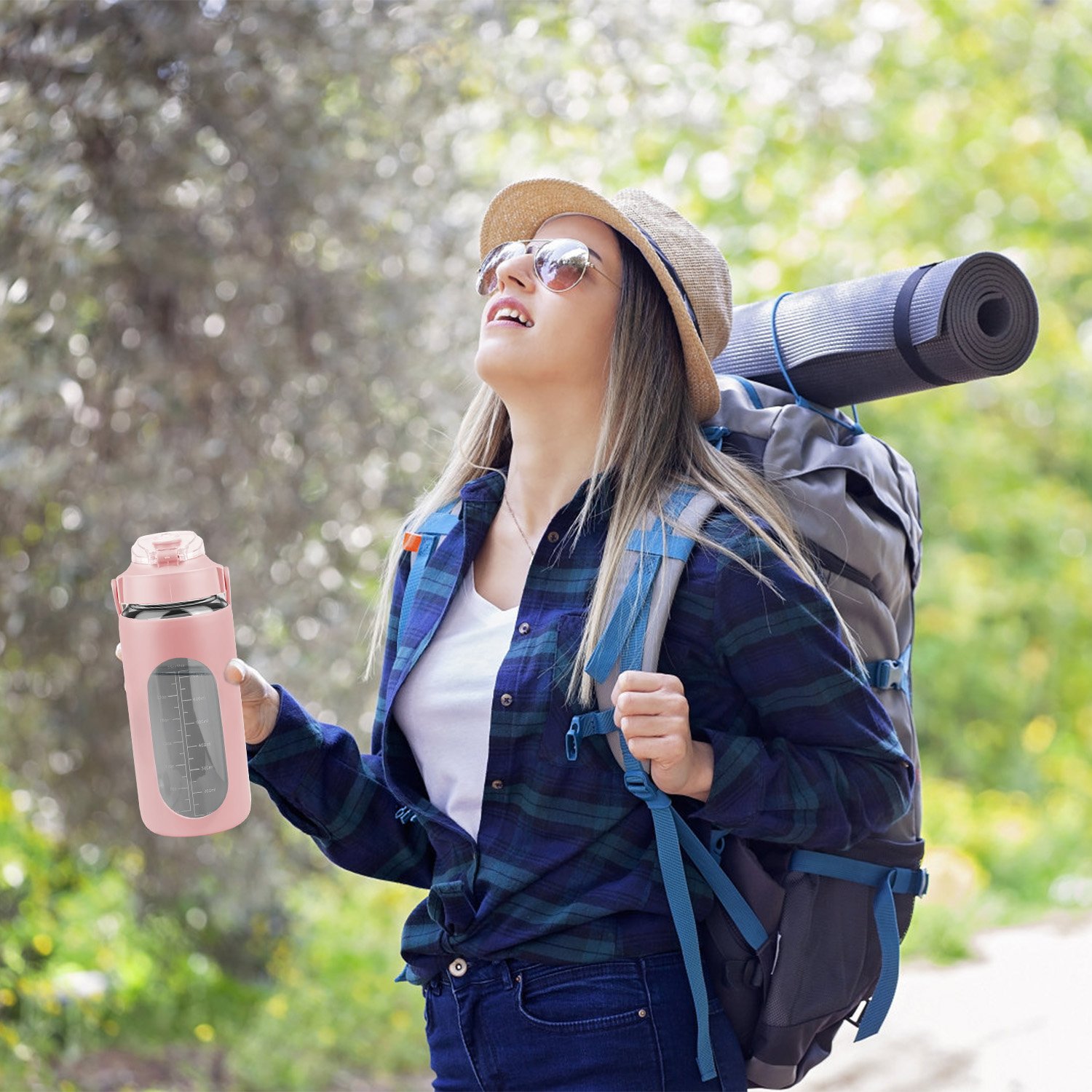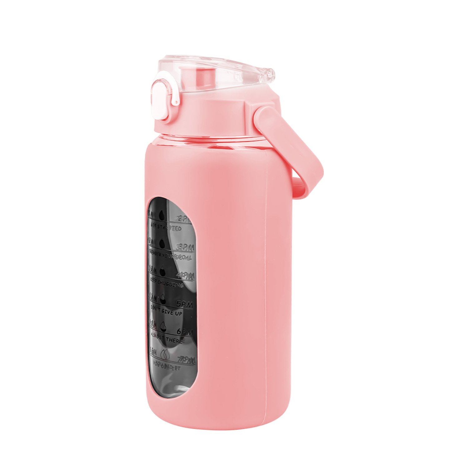 Are you tired of forgetting to stay hydrated throughout the day? Look no further than our motivational water bottle! Comes with timer markers and and precise volume on the side, helping you track your water intake with ease. With its large capacity(32Oz or 64 Oz), you can refill the sports water bottle up less frequently and keep yourself refreshed all day long. Made of high borosilicate glass, suitable for both warm and cold beverages, heat-resistant, dishwasher safe and healthy to use. Slip resistant with silicone sleeve and easy to carry with a built-in handle. And for added convenience, it features a built-in straw, making it easy to drink water on the go. Plus, its stylish design and motivational messages will inspire you to keep pushing towards your health goals. So why wait? Invest in our water intake tracker bottle today and take the first step towards a healthier, happier you!
