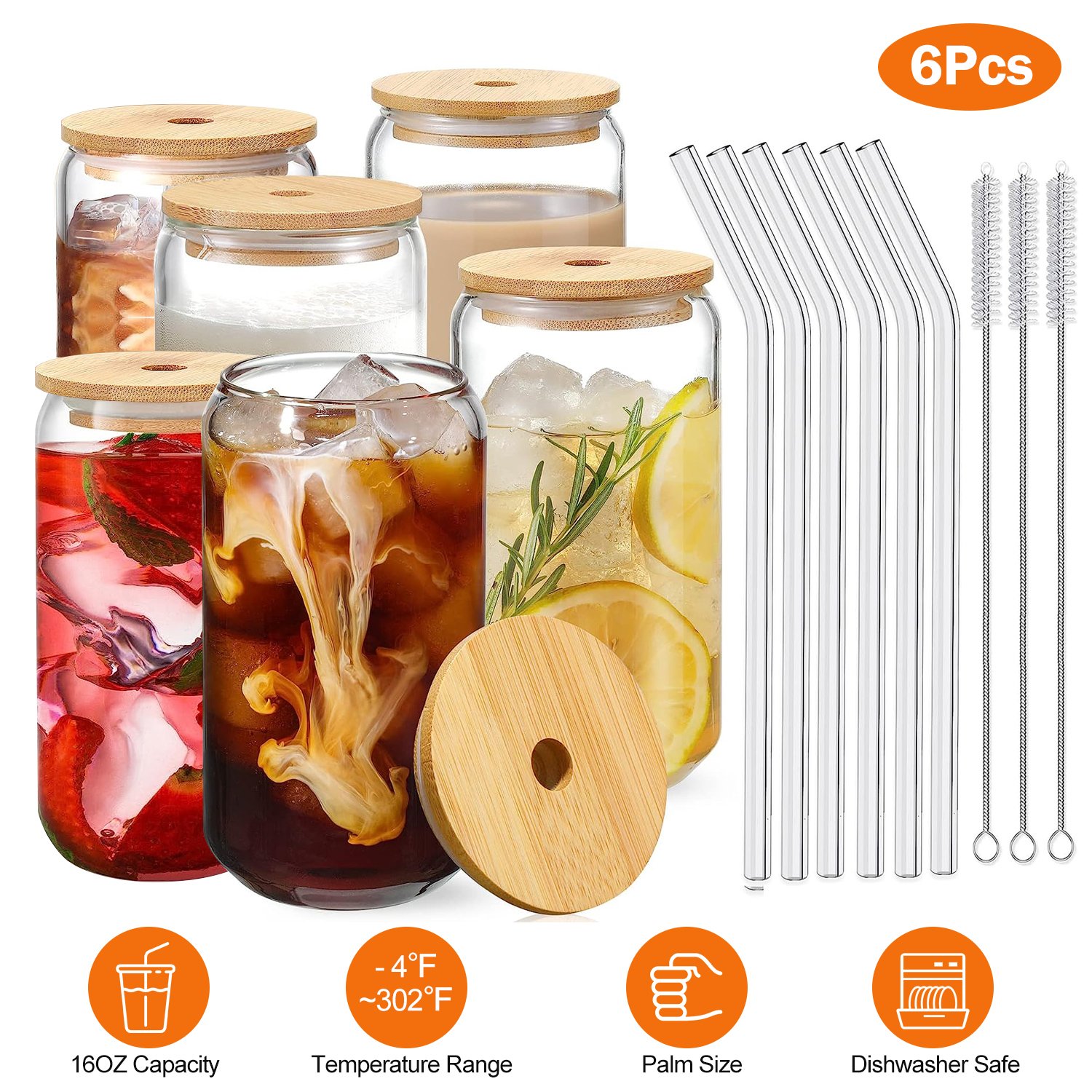 Home > 6Pcs Mason Jar Cups with Lid 16OZ Reusable Glass Beer Can with Bamboo Lids Glass Straws Cleaning Brush for Iced Coffee Smoothie Tea