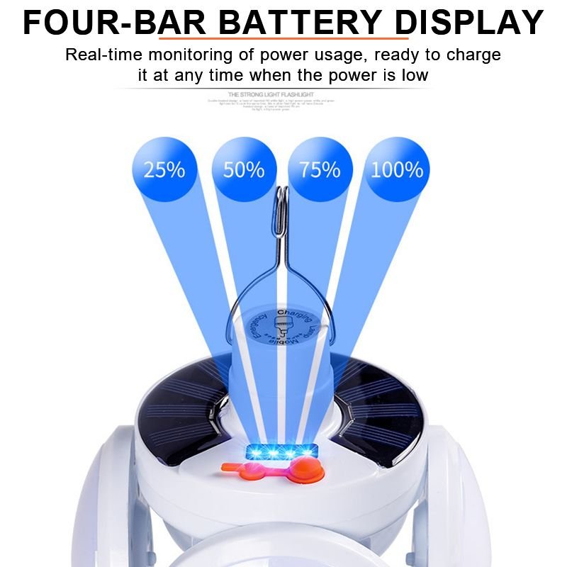Level 4 power display: 0-100% power display. It can be used for courtyard; camping; emergency lighting; fishing; etc.
