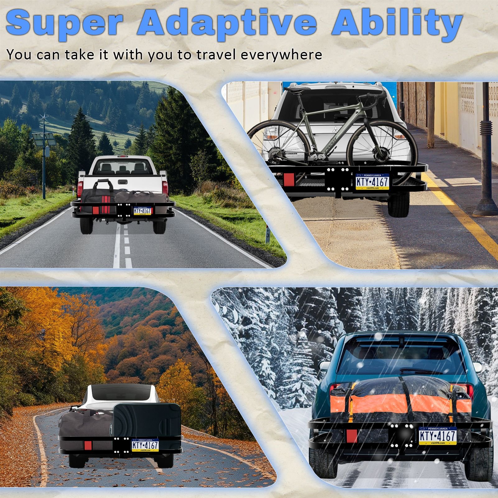 3.Practical Accessories:Considering your needs, we have prepared vehicle cargo carrier’s complete accessories for you. A large capacity waterproof cargo bag protects your luggage from rain and snow, cargo net holds the luggage bag together with tow hitch cargo carrier, and a lock of cargo cart for hitch with wheels ensures the safety of your luggage
